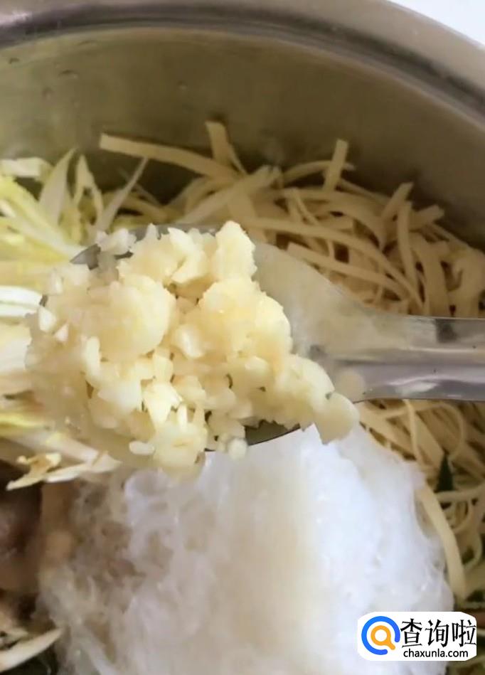 接着我们开始调味,放入适量的盐,味精,白糖,再倒入两勺陈醋,一点香油,再放入一些蒜末与香菜,倒入适量的辣椒油