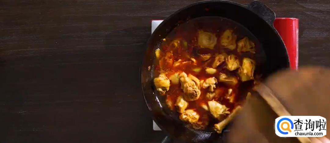 热锅凉油放入豆瓣酱炒出红油,加入花椒、八角、干辣椒、姜片、蒜瓣、葱段和鸡肉继续翻炒,然后加入生抽搅拌均匀后倒入水大火烧开。