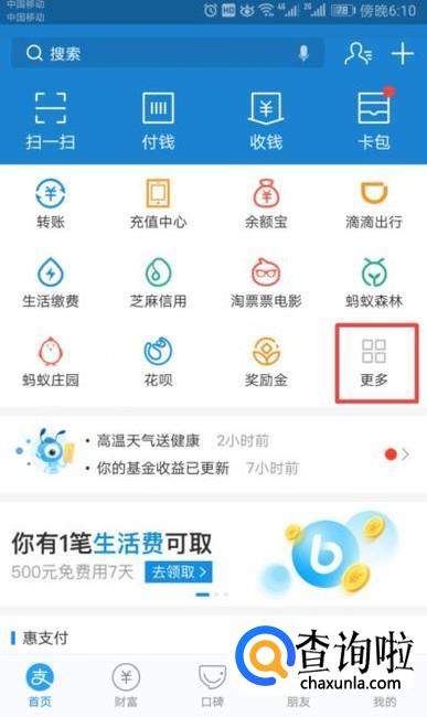 首先,我们打开我们手机上的支付宝,然后我们点击更多;