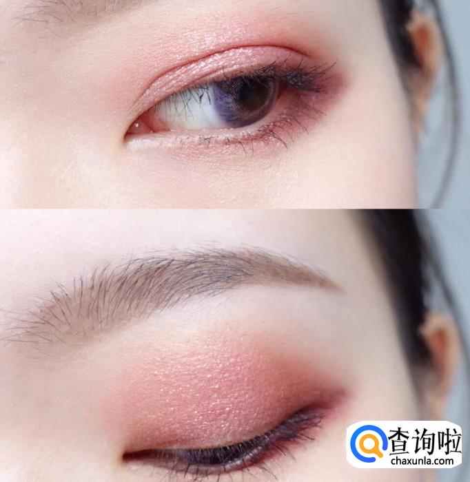 眼影:我们选择枣粉丝的眼影打底,因为这个颜色简直就是粉色系里面的百搭色,可以温柔又可以非常的俏皮,打底完成以后,用到比较偏紫粉的颜色晕染整个眼皮,最后我们用到比较偏深一点的粉色在我们的眼尾以及下眼影晕染,这一步一定要晕染好。