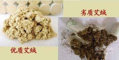 看颜色,好的艾绒是卡其色,有少量的绿色,黑色的茎和细小的颗粒。 劣质艾绒是青色,茎秆颗粒大而且很多。