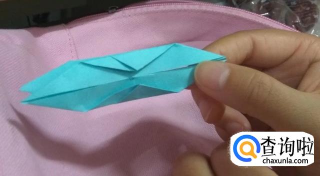 使劲折一下,然后照着下图把它的两边都向里面折一下。折好之后,就把两边向上折好。再把两边都放下来,如图所示。