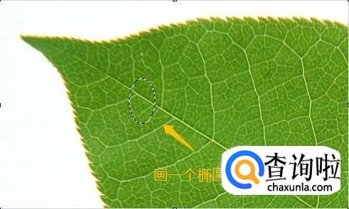 接着我们在左侧的工具里找到"椭圆选框工具",然后在刚才的叶子素材任意位置画一个椭圆出来,如下图;