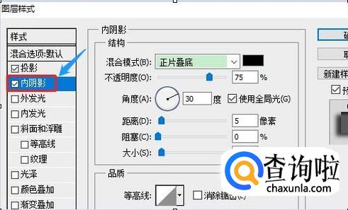接着依旧在该对话框,这次我们切换至"内阴影"选项,设置方法和刚才的一样,具体数值要根据背景以及自己想要的效果来设置,没有统一的参数供参考;