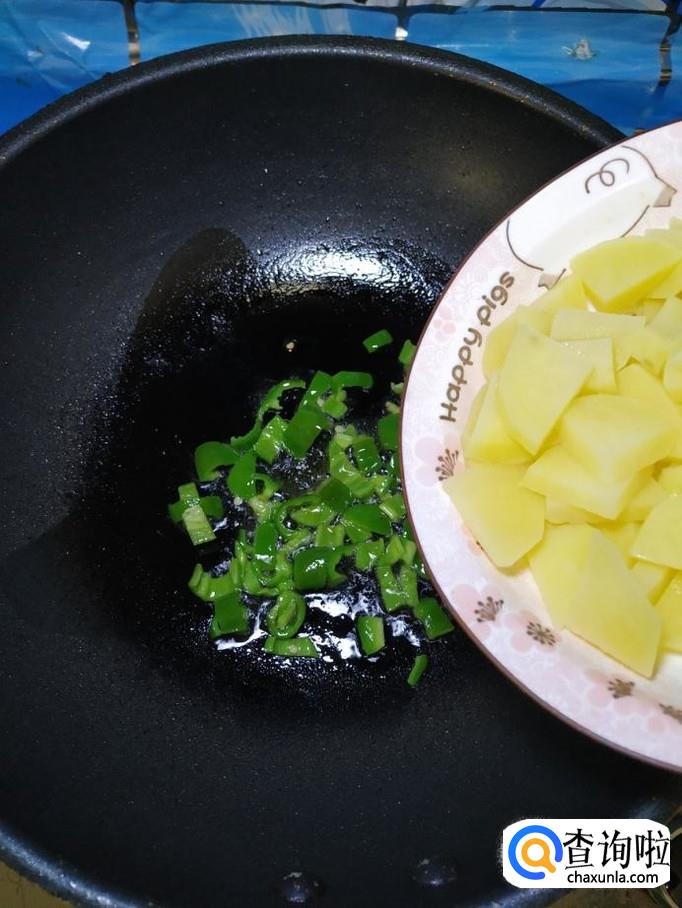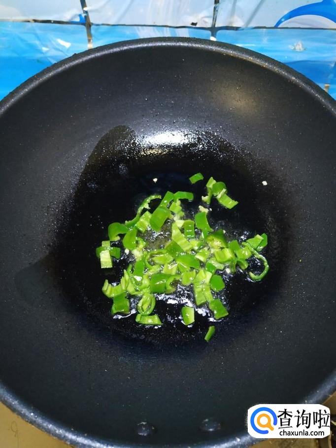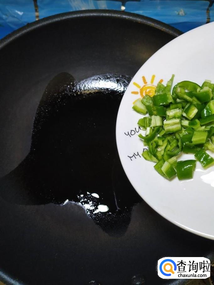 炒锅中放入适量油,油热后,将青椒粒放入锅中炒一下。