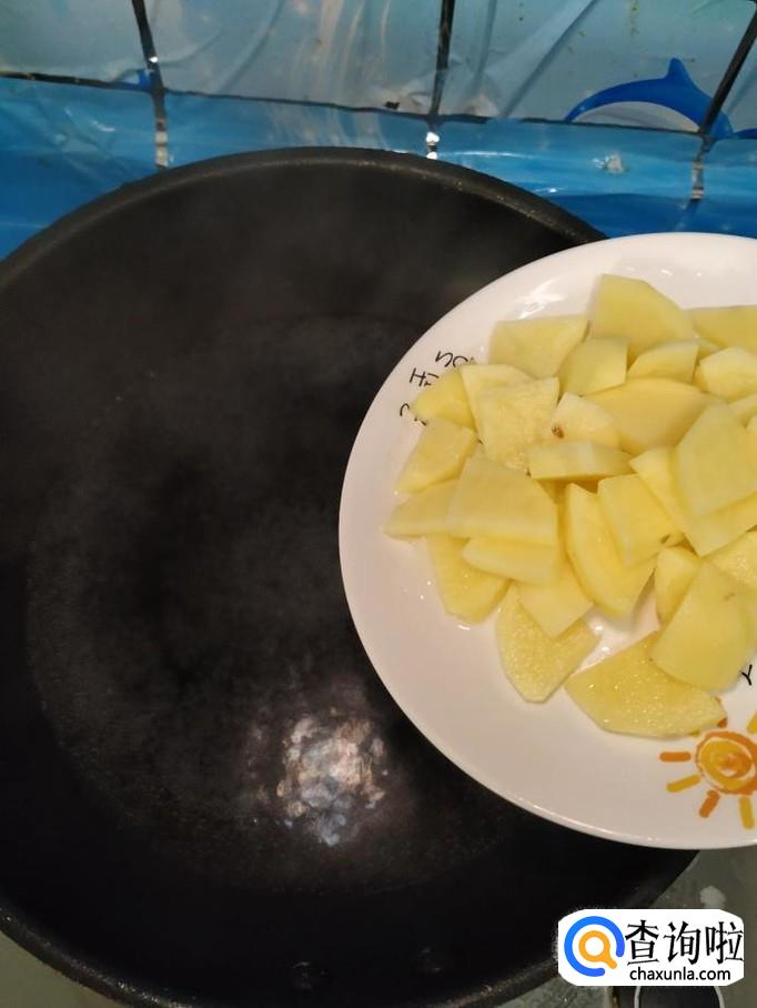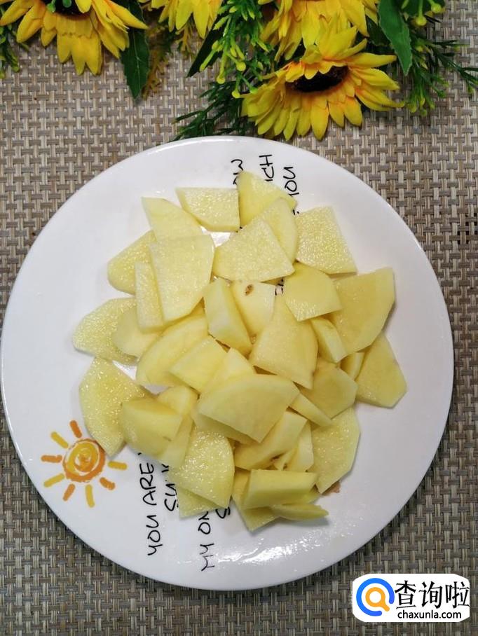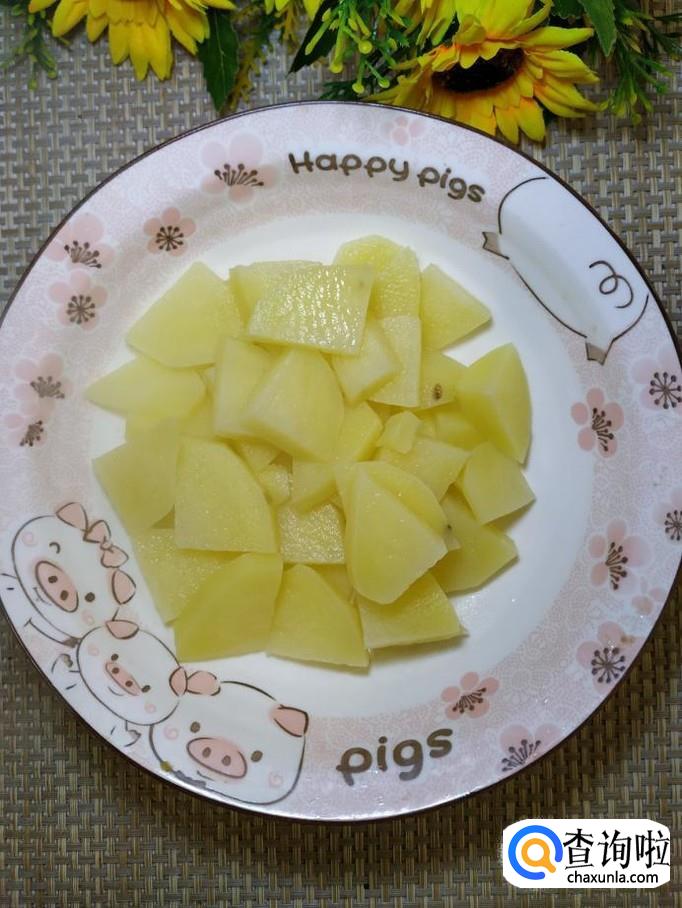 准备适量的土豆,洗净去皮后,切成片儿,洗去淀粉,放入盘中备用。