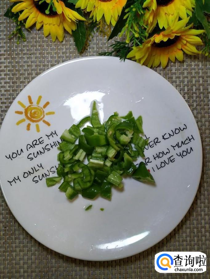 准备适量青椒,洗净后,切成小粒,放入盘中备用。