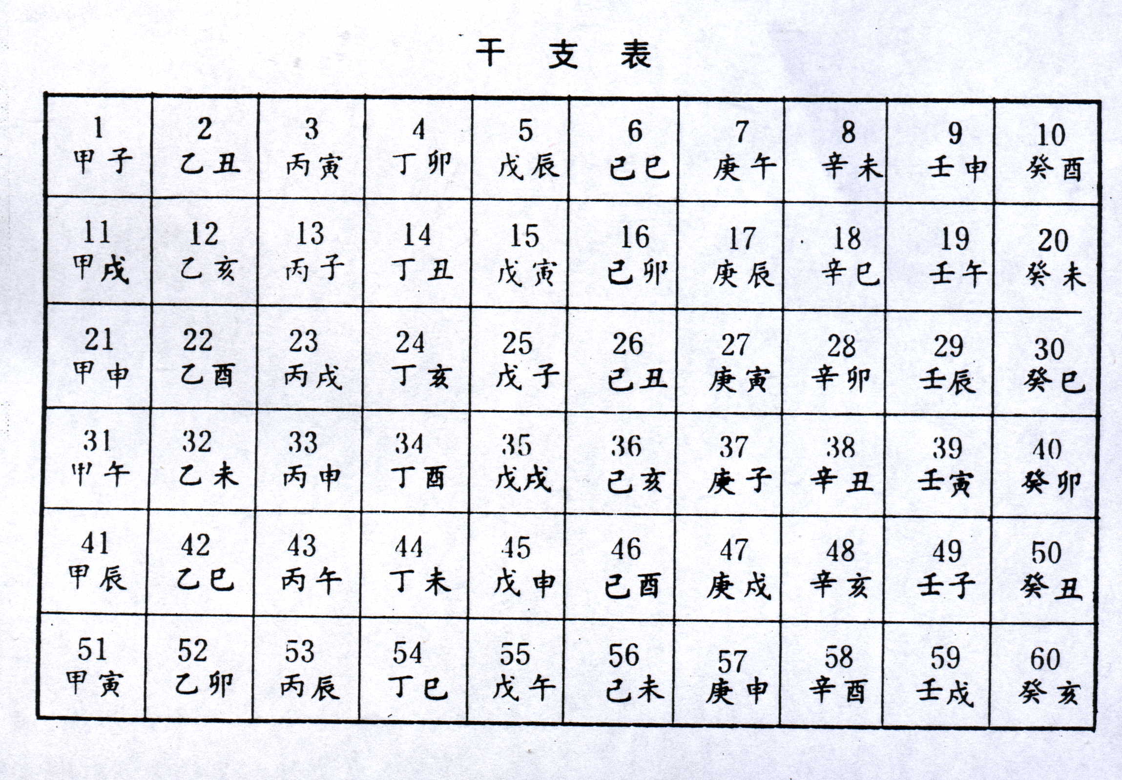 十天干和十二地支进行循环组合:甲子、乙丑、丙寅一直到癸亥,共得到60个组合,称为六十甲子,如此周而复始,无穷无尽。年月日时都是60一个循环。60在时间领域是个奇妙的数字。不但中国古人用60作为循环,现在来自西方的计时法中,一分钟是60秒,一小时是60分钟。