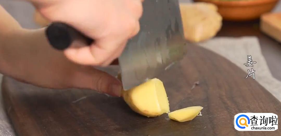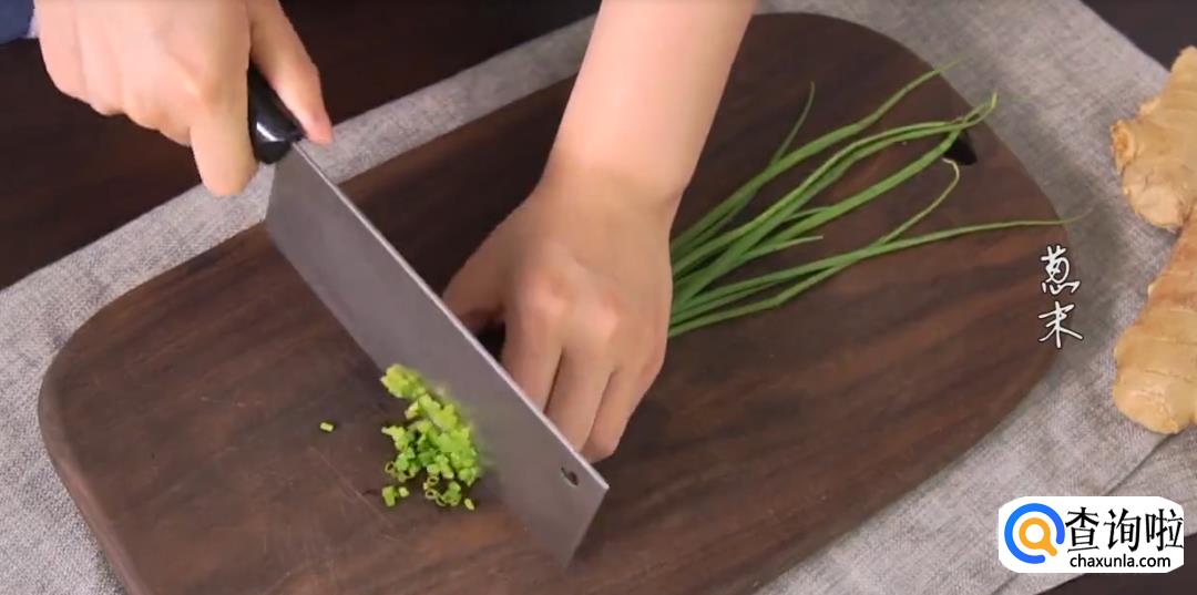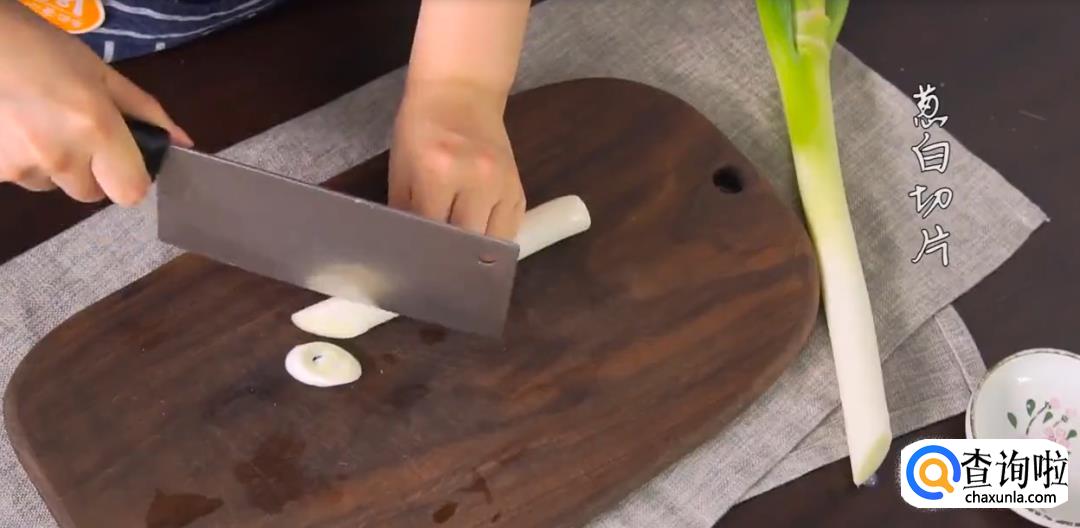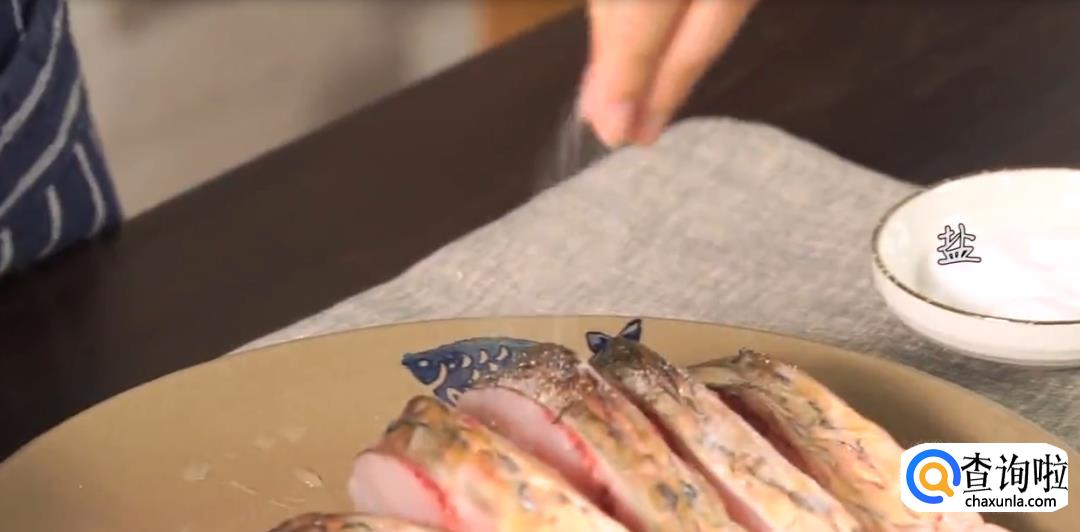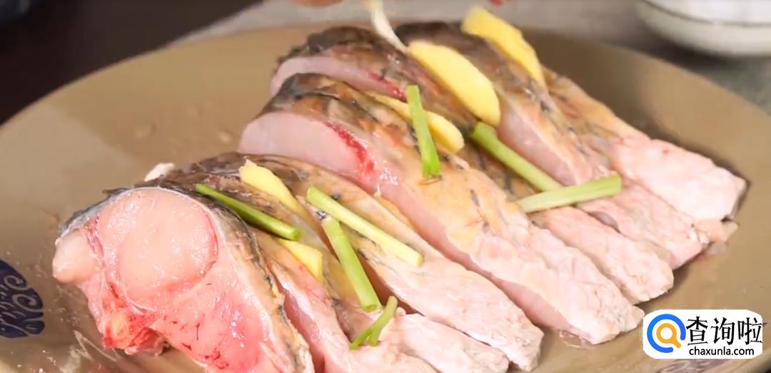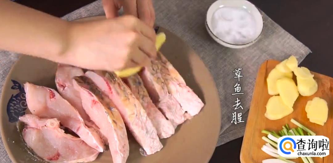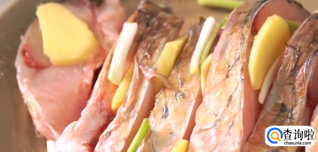 草鱼身上摸盐,用姜片擦拭祛除腥味,将姜片和葱段塞在草鱼鱼肉间隔内腌制片刻。
