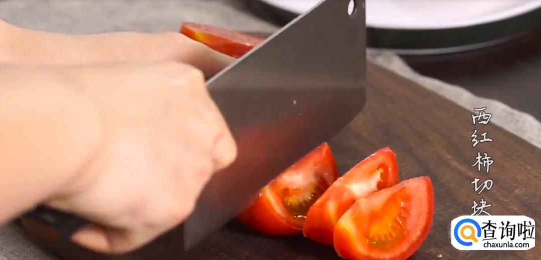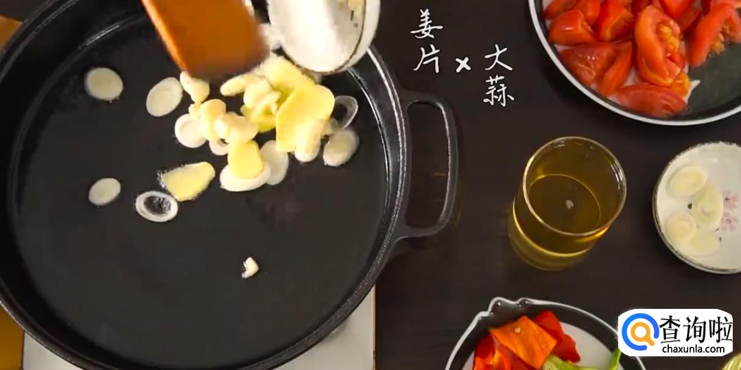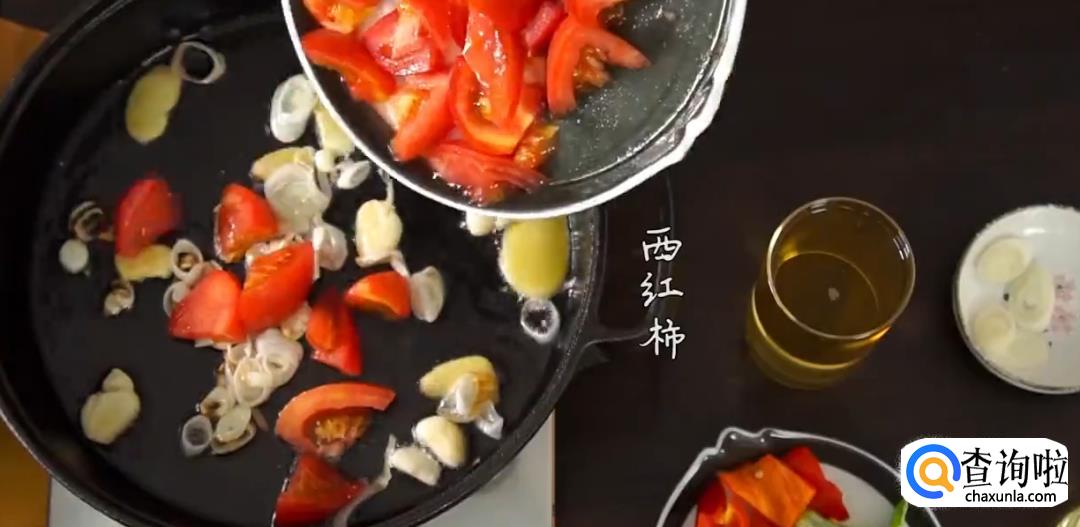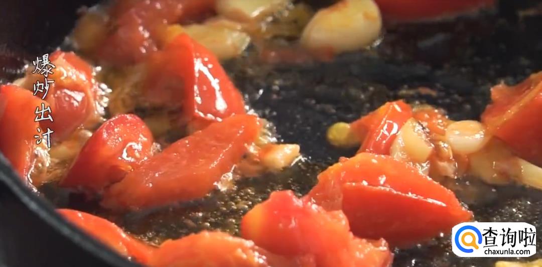下葱姜蒜爆香,倒入番茄翻炒出汁。