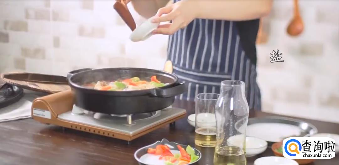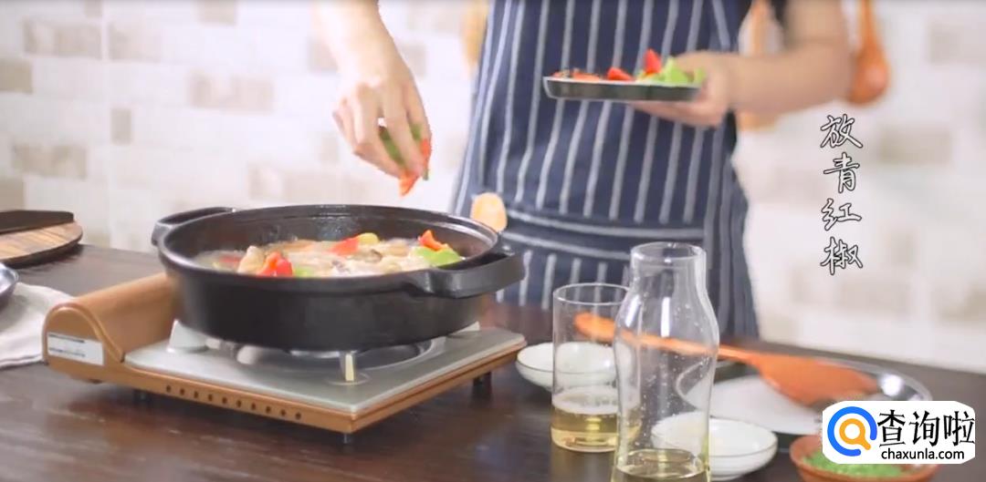 将鱼肉放入锅中,倒入一瓶啤酒,下青红椒块后盖上盖子焖煮。