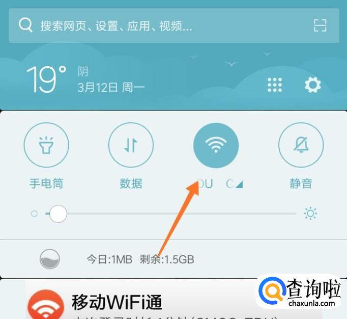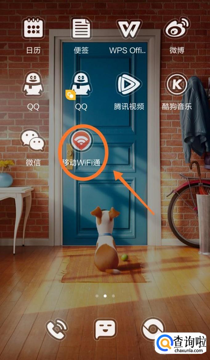 首先你得下一个软件,如图的移动WiFi通,这时候你没WiFi也没关系,用流量下载就行,因为它只需要几兆的流量。