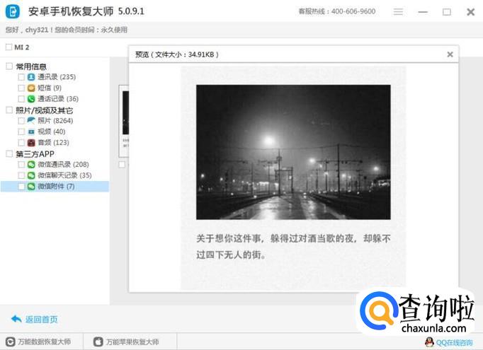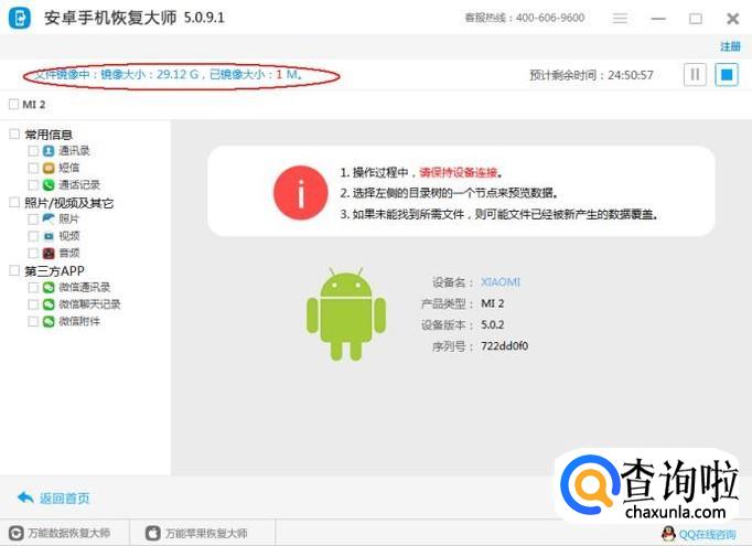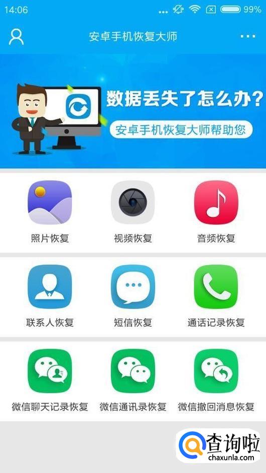打开安卓手机恢复大师软件,在界面上直接选择“照片恢复”图标,点击进入,软件便开始扫描手机上的数据。