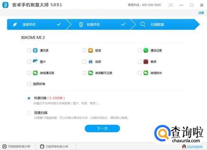 使用数据线连接vivo手机到电脑上后,运行安卓手机恢复大师,软件识别到手机已经连接成功,会自动显示数据类型,选择“照片”,再点击下一步。