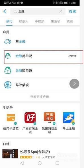 下载支付宝APP,登陆会员,在搜索框搜索金融简单说