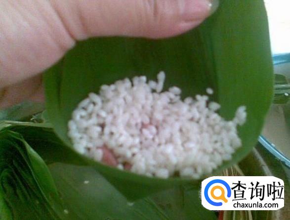 然后放V的三分之一的糯米进去,再放适量的绿豆,然后放一到两块的五花肉进去,用糯米铺盖住,然后把粽叶尖折包盖住食材。