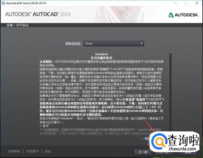 和很多软件相同,我们首先需要同意cad的软件安装协议,点击我同意后,点击下一步。