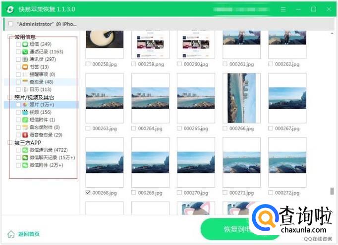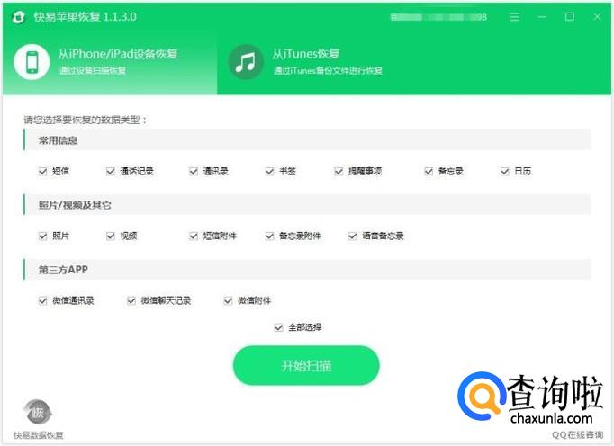 将手机连接到电脑上,运行快易恢复软件,在界面上软件识别到手机之后,会显示要恢复的数据类型,选择我们要恢复的数据,可以全选。