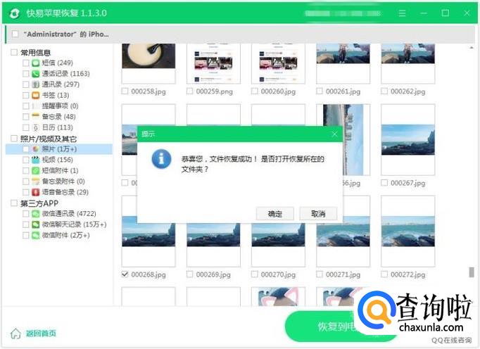 相对应的点击左侧的每个目录,比如说要恢复照片,那么点击照片查看数据,可以先预览,预览显示正常的照片就是可正常恢复的。