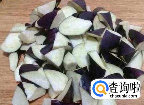 将茄子去掉根,切成均匀的块,蒜切成蒜末。