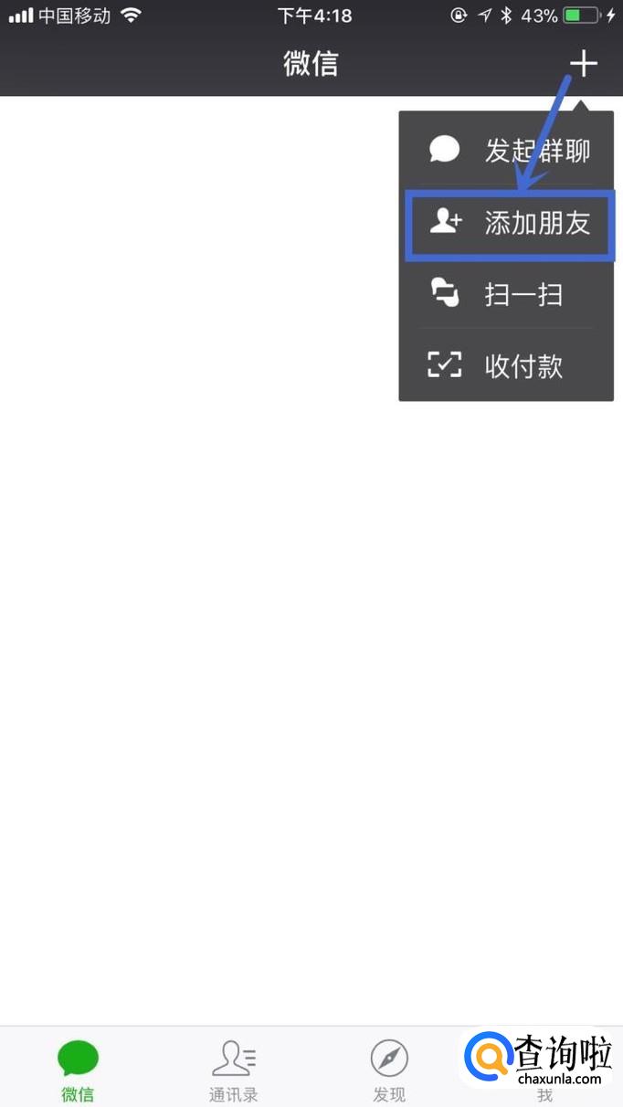 然后点击屏幕上方的“+”,接着点击添加朋友,如下图所示。