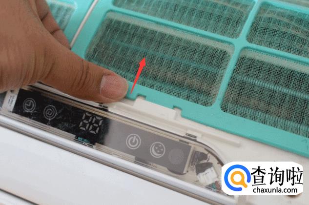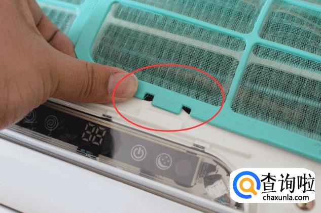 取滤网也是有讲究的,用手指按住滤网与内机连接处。