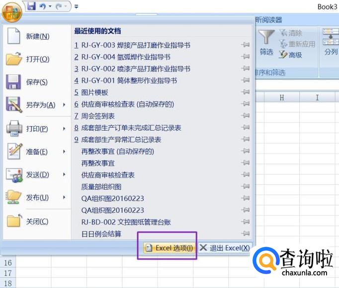然后我们点击左上角的office按钮,弹出的界面点击Excel选项;