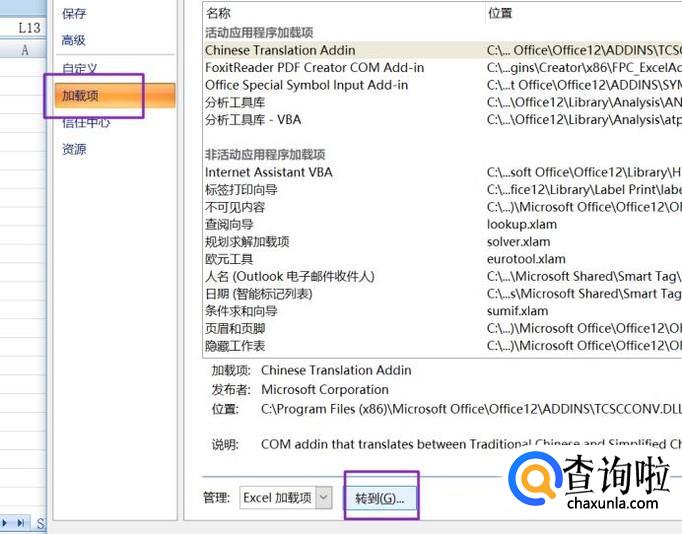 弹出的界面,我们点击加载项,点击转到;
