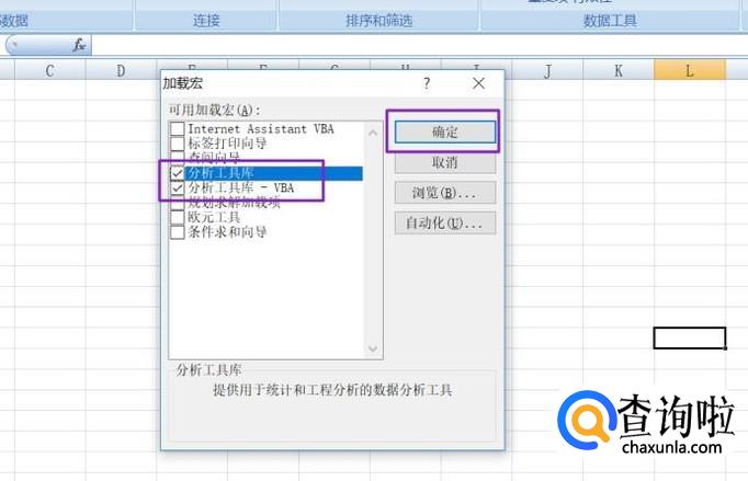 弹出的界面,我们将分析工具库和分析工具库-VBA均勾选上,然后点击确定;