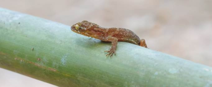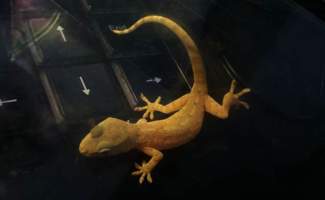 壁虎可以朝天仰着身子走。壁虎的指、趾端扩展,其下方形成皮肤褶襞,密布腺毛,有粘附能力,可在墙壁、天花板或光滑的平面上迅速爬行。壁虎每走一步,就像把脚像贴纸一样从墙上撕下来,然后黏到别处。——放心了,粘性甚强的壁虎之脚并不会留下任何残留物,这是无数科学家绞尽脑汁也不知的地方。