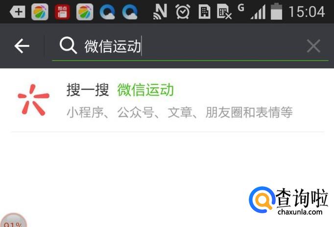 如后输入“微信运动”,下面就会显示出有关信息,在下面的“微信运动”上点一下。