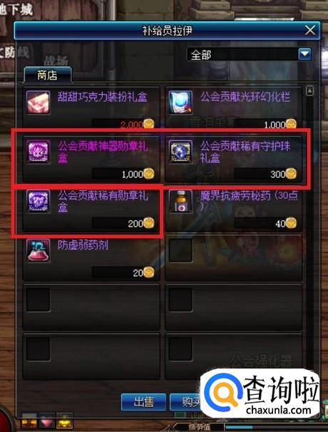 可以在公会大厅中,与NPC补给员拉伊进行对话,在拉伊的商店中,可以消耗一定数量的“公会贡献币”兑换神器级的勋章礼盒或稀有级的勋章和守护珠礼盒。