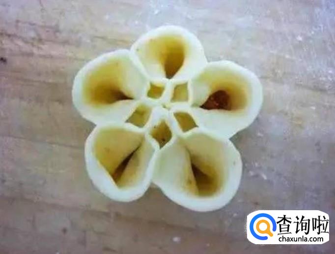面粉做法同上,均分五点向中心捏在一起,把相邻的两边再相粘结,在每片花瓣上用手指“剪”两刀,就形成了牡丹花的花瓣。