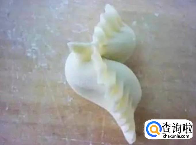 包入菜馅,捏成月牙饺,用拇指和食指捏出花边,两边向后捏,捏出一对翅膀。