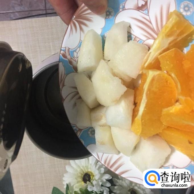 然后把橙子和白梨倒进电热杯。