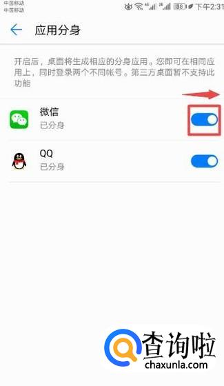 弹出的界面,我们将微信的应用分身开关向右滑动打开,这样我们就开启了微信的分身了,此时我们也就可以登录两个微信号了。