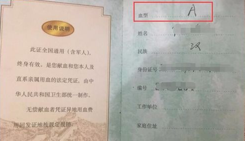 3. 通过献血可以知道我们自己的血型,献完血后护士会给你一本无偿献血证,在献血证的第一页第一行就可以看到你的血型了,如下图。