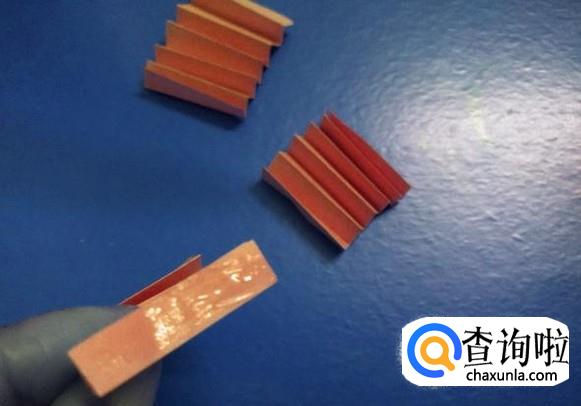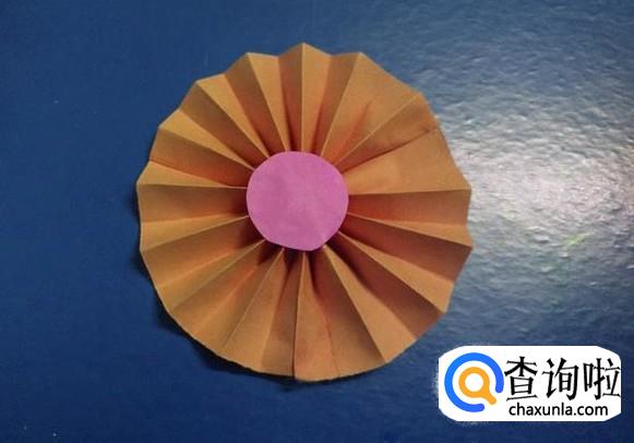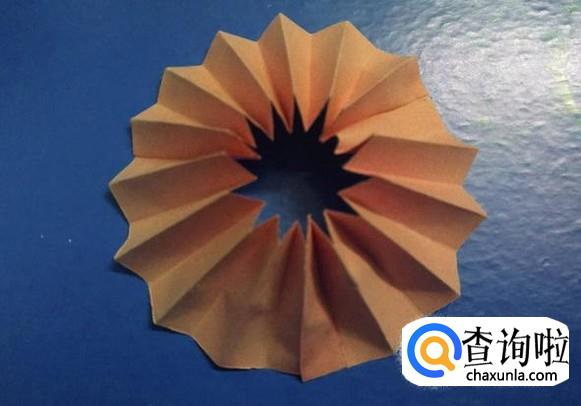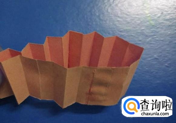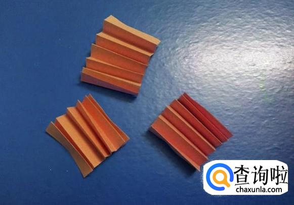 把3个风琴褶的两边抹上胶水,互相粘到一起呈圆圈形,然后翻折成第三图的样子。