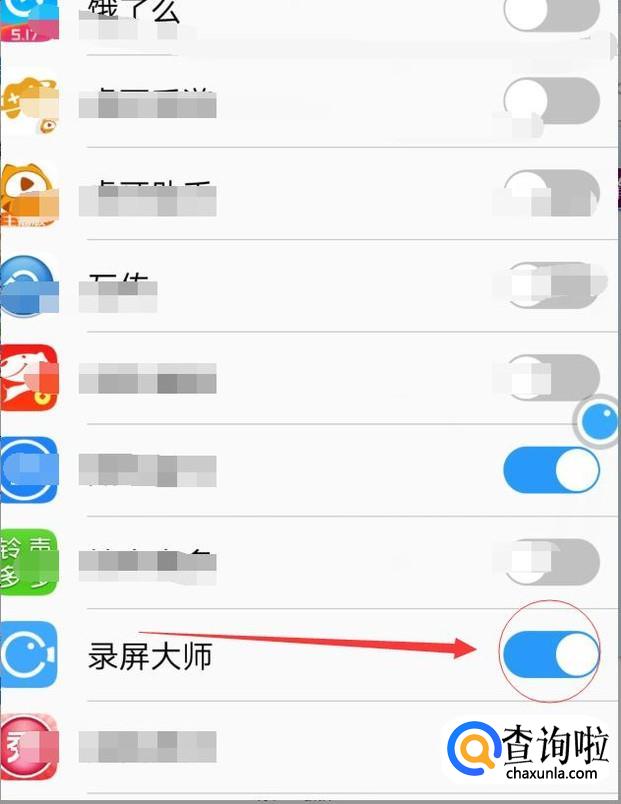 在下面的应用里找到“录屏大师权限”在右侧的选择栏,点击开启。