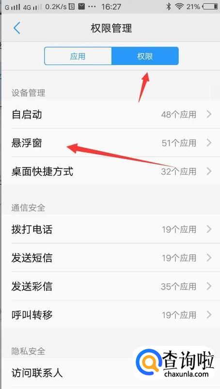 在权限管理页面。点击右侧的权限按钮,在下面就会出现很多的应用权限。点击悬浮窗选项。