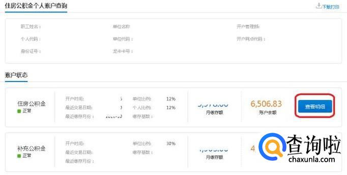 此时,就能看到账户状态了,一般公积金贷款只考虑公积金流水,不能使用补充公积金计算,所以我们点击公积金右侧的“查看明细”。