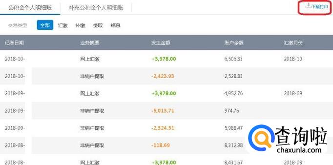 可以在下一页面中看到公积金流水了,如图所示,右上角有一个“下载打印”按钮,点击能生成PDF格式的公积金流水,我们打印出来就可以了。