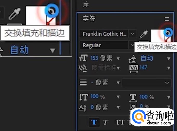 接下来展开右侧的字符属性面板,点击交换填充和描边按钮,如下图所示