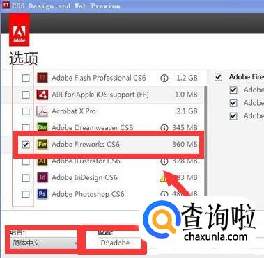 点击【稍后连接】后,就会显示一下页面,在左边找到需要安装的adobe的软件,在下方的语言选择【简体中文】,并确认好安装位置,这样就可以点击下方的【安装】了。