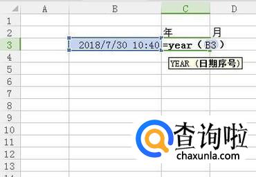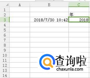 然后在C3单元格输入“=YEAR(B3)”并点击回车键,提取当前时间中的年。