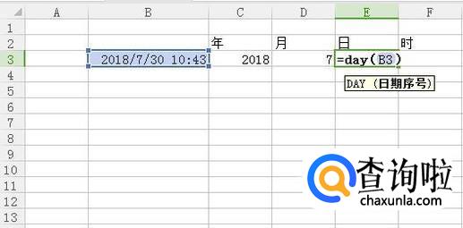 然后在E3单元格输入“=DAY(B3)”并点击回车键,提取日期中的日,如下图所示。