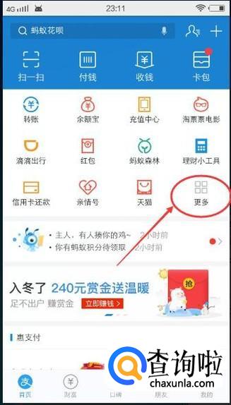 打开支付宝,然后在主界面点击【更多】图标,如下图所示: