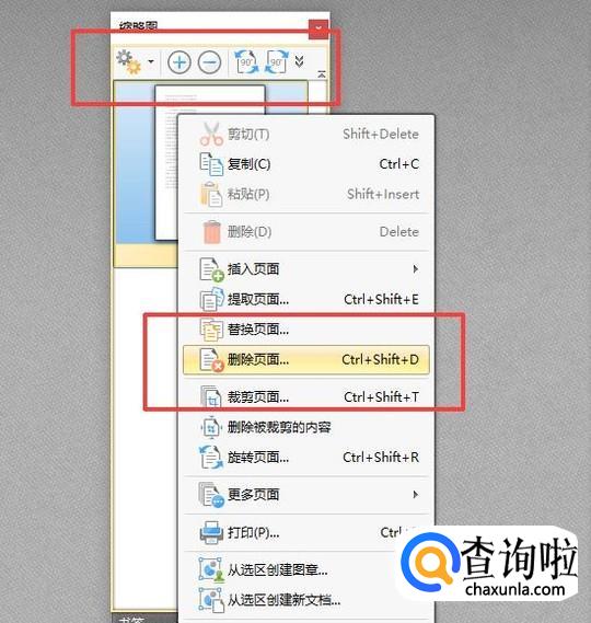 点击页面缩略图工具后,在页面中可以选中页面点击鼠标右键选择删除页面将文件的页面删除,也可以选择工具栏中的设置,选择删除页面。
