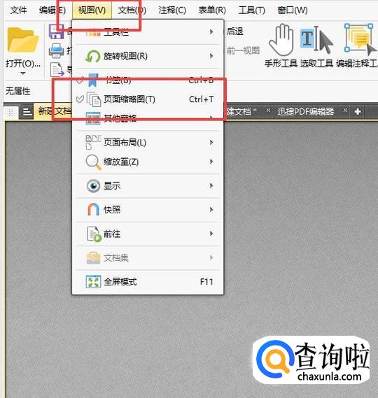 也可以选择菜单栏中的视图选项,在视图选项中点击页面缩略图工具,在页面缩略图中也会有很多的工具可以编辑文件。