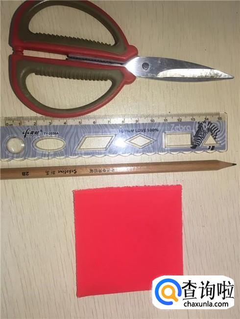 首先准备好所有工具,一把剪刀、一把尺子、一张红色正方形红纸、一支笔。